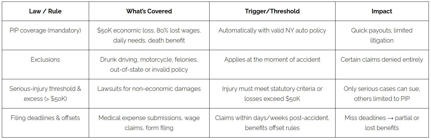 | PIP coverage (mandatory) | $50K economic loss, 80% lost wages, daily needs, death benefit | Automatically with valid NY auto policy | Quick payouts; limited litigation |